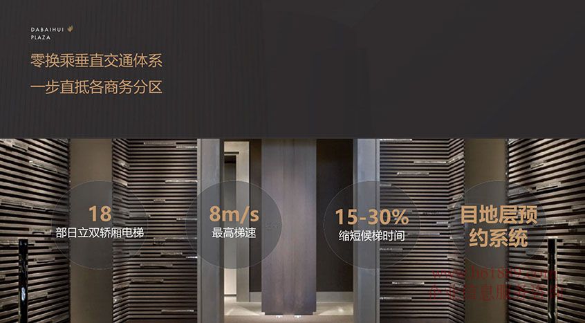 零換乘垂直交通體系、一步直低各商務(wù)分區(qū)、18部日立雙轎廂電梯、8m/s最高梯速、縮短侯梯時(shí)間:15到30%