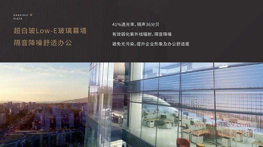 超白玻Low-E玻璃幕墻、隔音降噪舒適辦公、41%透光率、隔聲36分貝、有效弱化紫外線輻射、隔音降噪、避免光污染、提升企業(yè)形象及辦公舒適度