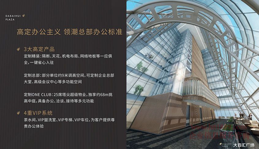私募證券大廈【大百匯廣場(chǎng)】高定辦公主義、領(lǐng)潮總部辦公標(biāo)準(zhǔn)、3大高定產(chǎn)品、定制精裝:隔斷、天花、機(jī)電布局、網(wǎng)絡(luò)地板等一應(yīng)俱全、一鍵省心入駐、定制總部:部分單位約9米調(diào)高空間、可定制企業(yè)總部大堂、高級(jí)會(huì)議中心等多功能空間、定制ONE、CLUB:25席塔尖超級(jí)物業(yè)、獨(dú)享約68m挑高中庭、具備辦公、洽談、接待等多元功能、4重VIP系統(tǒng)、茶水間、VIP盟洗室、VIP專梯、VIP車位、為客戶提供尊貴辦公體驗(yàn)
