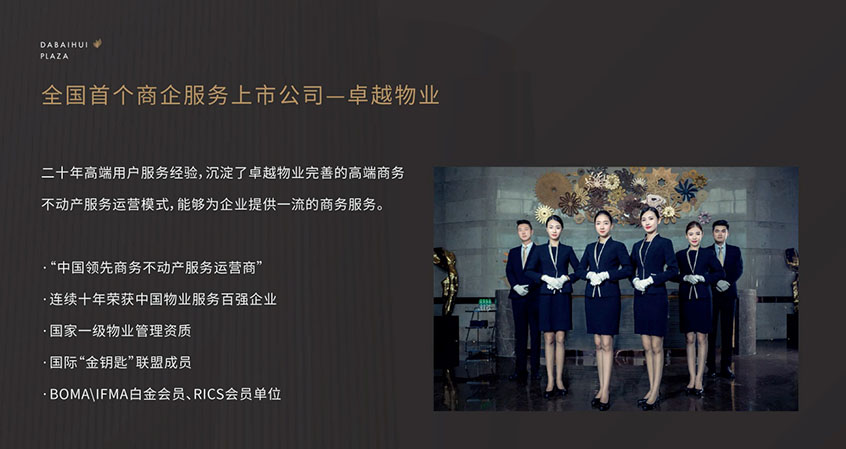 二十年高端用戶服務(wù)經(jīng)驗(yàn)、沉淀了卓越物業(yè)完善的高端商務(wù)、不動(dòng)產(chǎn)服務(wù)運(yùn)營模式、能夠?yàn)槠髽I(yè)提供一流的商務(wù)服務(wù)、“中國領(lǐng)先商務(wù)不動(dòng)產(chǎn)服務(wù)運(yùn)營商”連續(xù)十年榮獲中國物業(yè)服務(wù)百強(qiáng)企業(yè)、國家一級(jí)物業(yè)管理資質(zhì)、國際“金鑰匙”聯(lián)盟成員、BOMA\IFMA白金會(huì)員、RICS會(huì)員單位