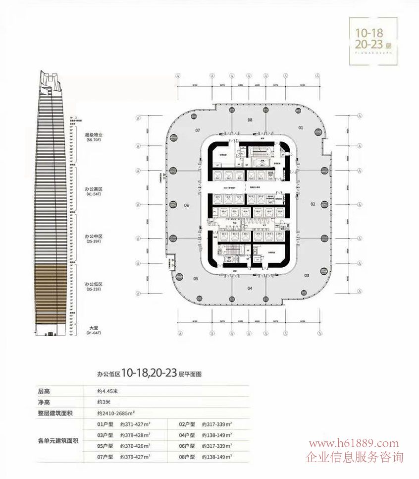 私募證券大廈【大百匯廣場(chǎng)】正式啟動(dòng): 出租 出售 私募證券大廈【大百匯廣場(chǎng)】、辦公低區(qū) 10到18層、20到23層平面圖、層高約:4.45米、凈高約3米、整層建筑面積約:2410平米到2685平米、各單元建筑面積: