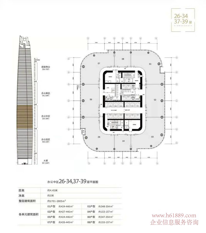 私募證券大廈【大百匯廣場(chǎng)】正式啟動(dòng):出租 出售 私募證券大廈【大百匯廣場(chǎng)】辦公中區(qū) 26到34層、37到39層平面圖、層高約:4.45米、凈高約3米、整層建筑面積約:2701平米到2805平米、各單元建筑面積: