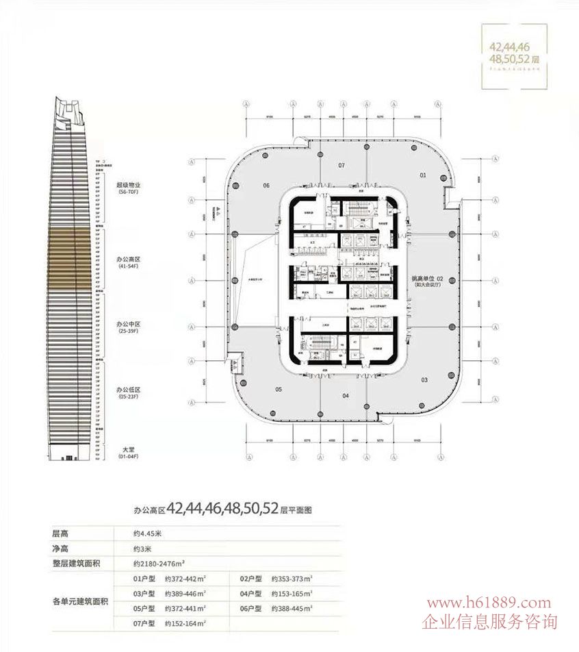 私募證券大廈【大百匯廣場(chǎng)】正式啟動(dòng):出租 出售 私募證券大廈【大百匯廣場(chǎng)】辦公高區(qū) 42層、44層、46層、48層、50層、52層平面圖、層高約:4.45米、凈高約3米、整層建筑面積約:2180平米到2476平米、各單元建筑面積: