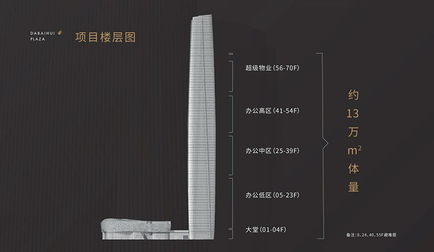 私募證券大廈【大百匯廣場(chǎng)】項(xiàng)目樓層:大堂(01到04F)、辦公低區(qū)(05到23F)、辦公中區(qū)(25到39F)、辦公高區(qū)(41到54F)、超級(jí)物業(yè)(56到70層)備注:8層、24層、40層、55F避難層