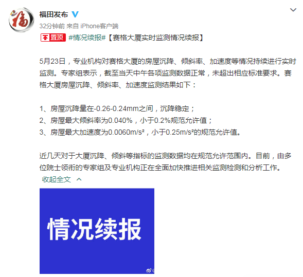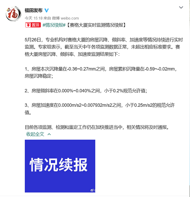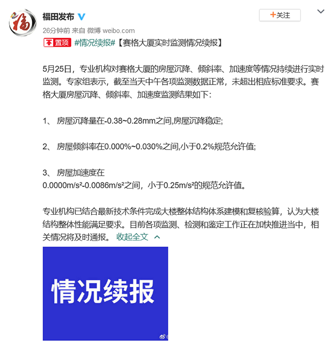 2021年5月26日,深圳市福田區(qū)人民政府發(fā)布“賽格大廈實時監(jiān)測情況續(xù)報”