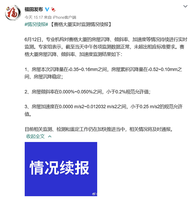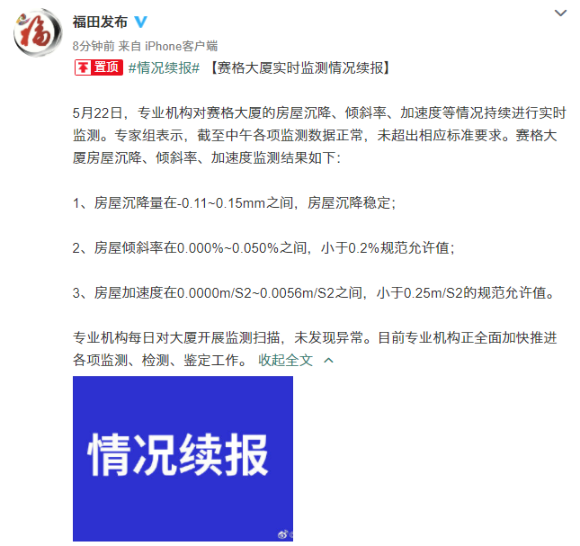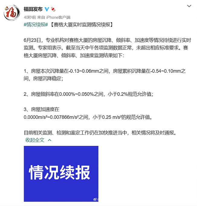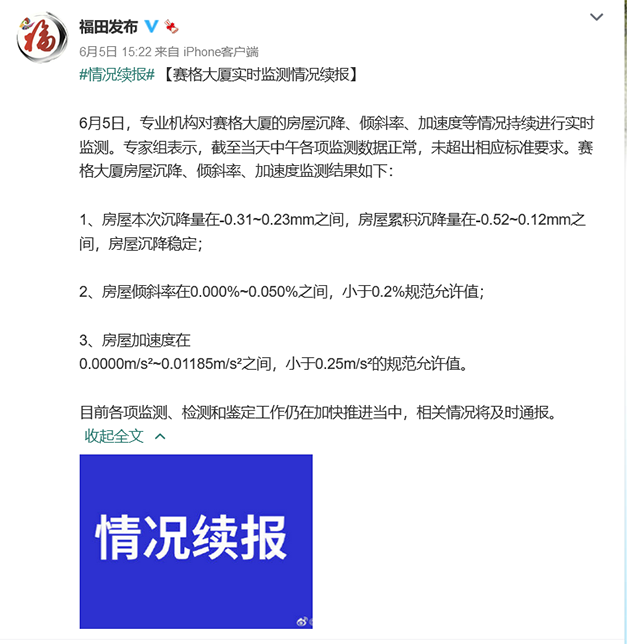 2021年06月23日,深圳市福田區(qū)人民政府發(fā)布“賽格大廈實時監(jiān)測情況續(xù)報”