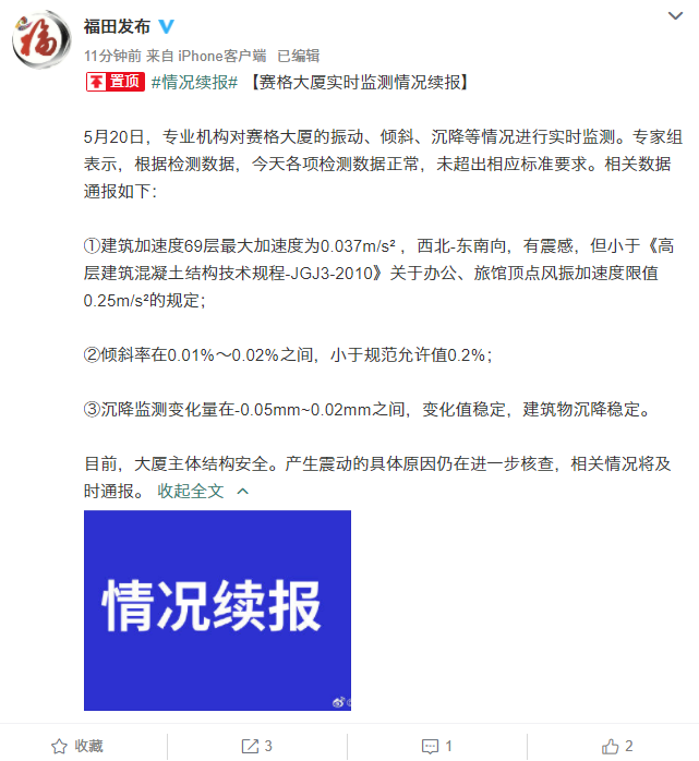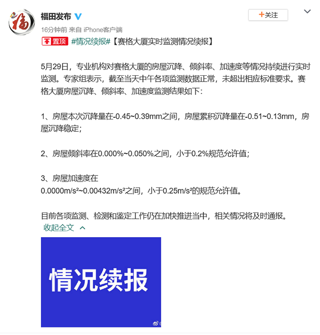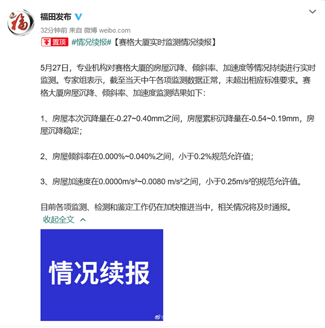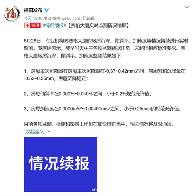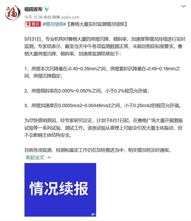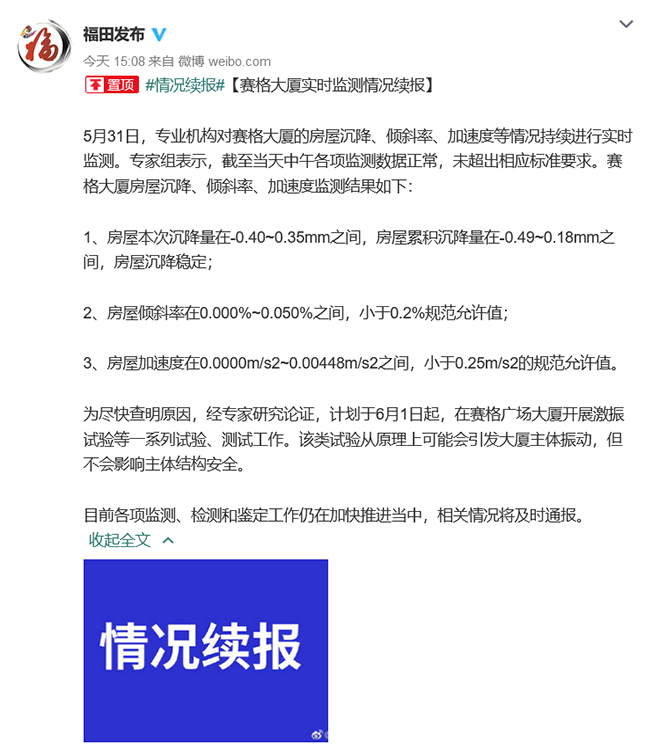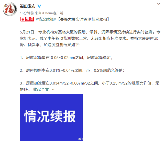 2021年5月31日,深圳市福田區(qū)人民政府發(fā)布“賽格大廈實時監(jiān)測情況續(xù)報”