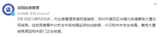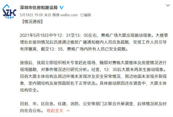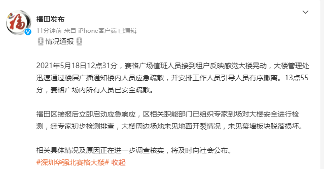 2021年5月18日18時許,深圳市福田區(qū)人民政府通報“深圳賽格大廈晃動事件”情況。