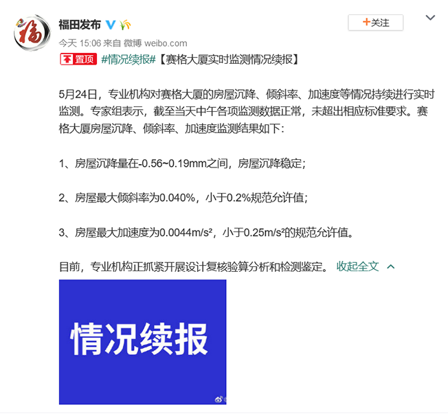 2021年5月24日,深圳市福田區(qū)人民政府發(fā)布“賽格大廈實時監(jiān)測情況續(xù)報”。