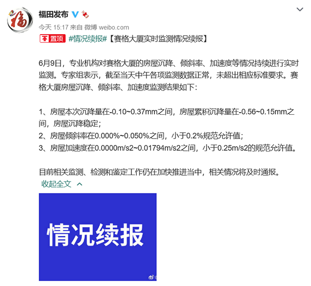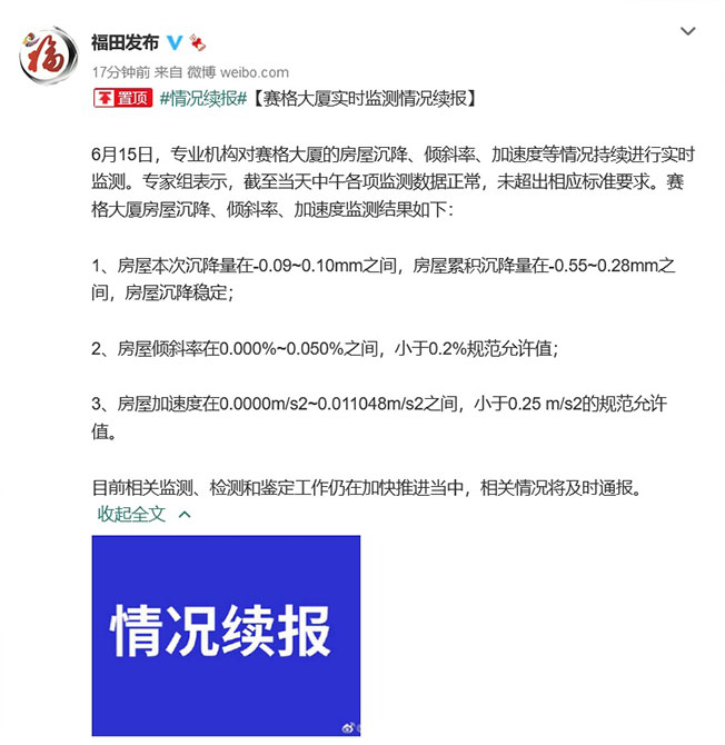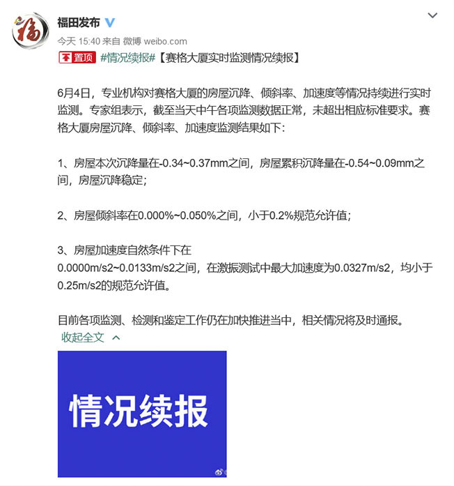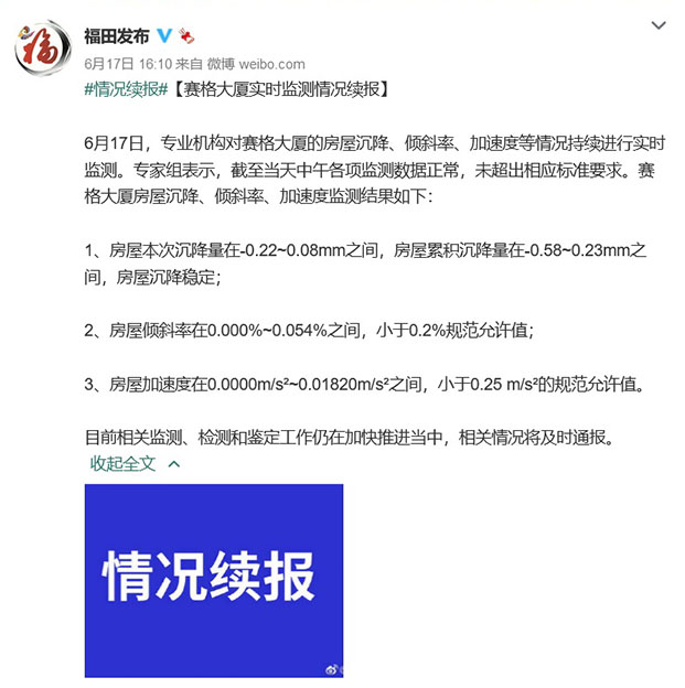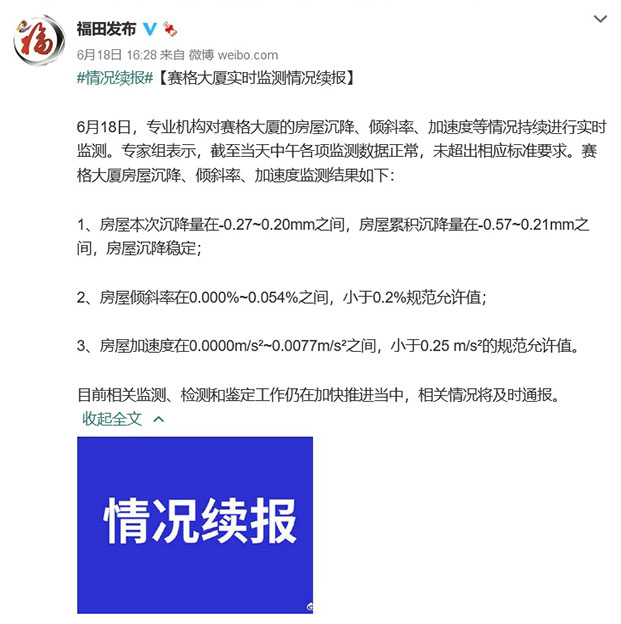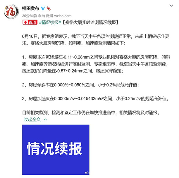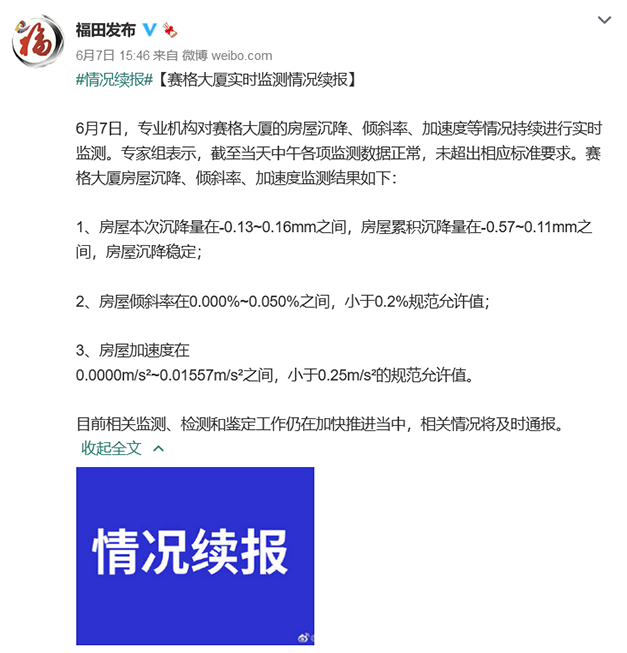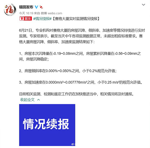 2021年06月30日,深圳市福田區(qū)人民政府發(fā)布“賽格大廈實時監(jiān)測情況續(xù)報”