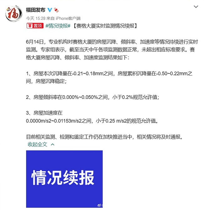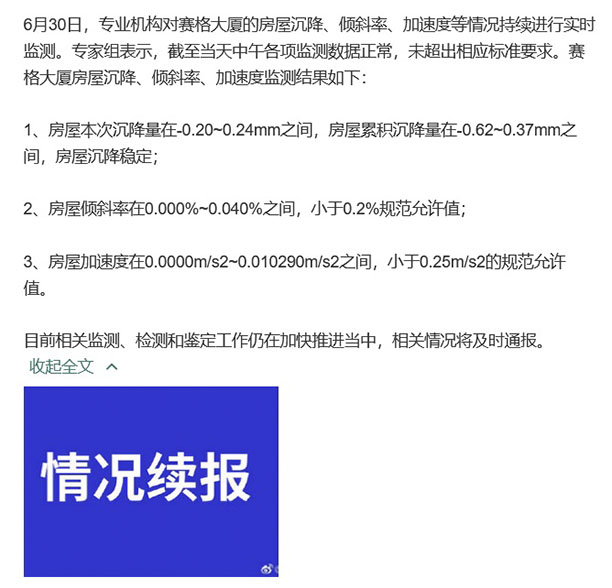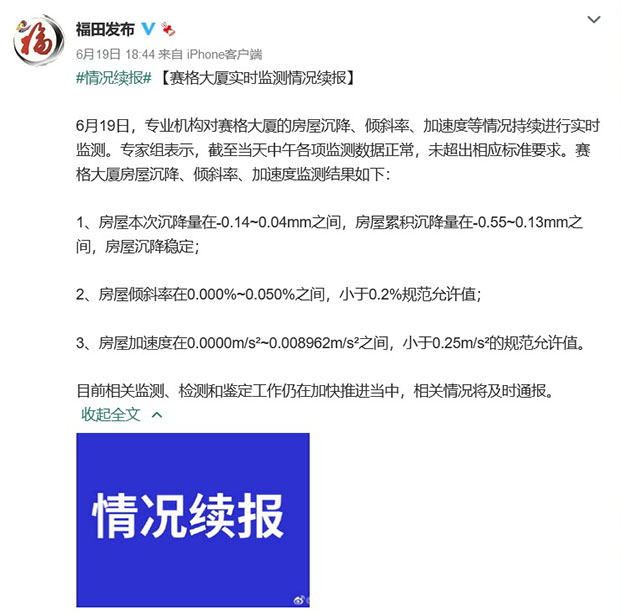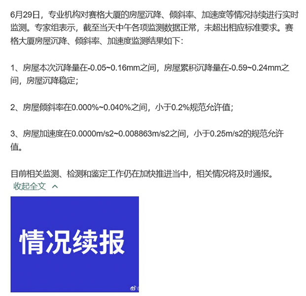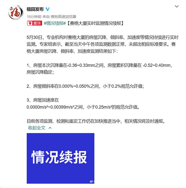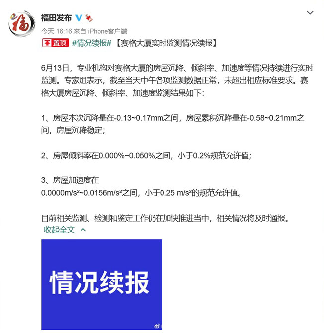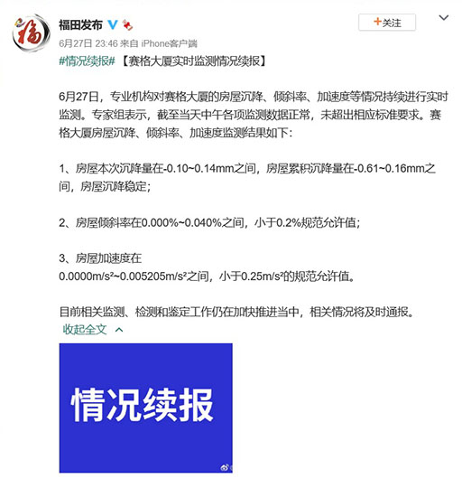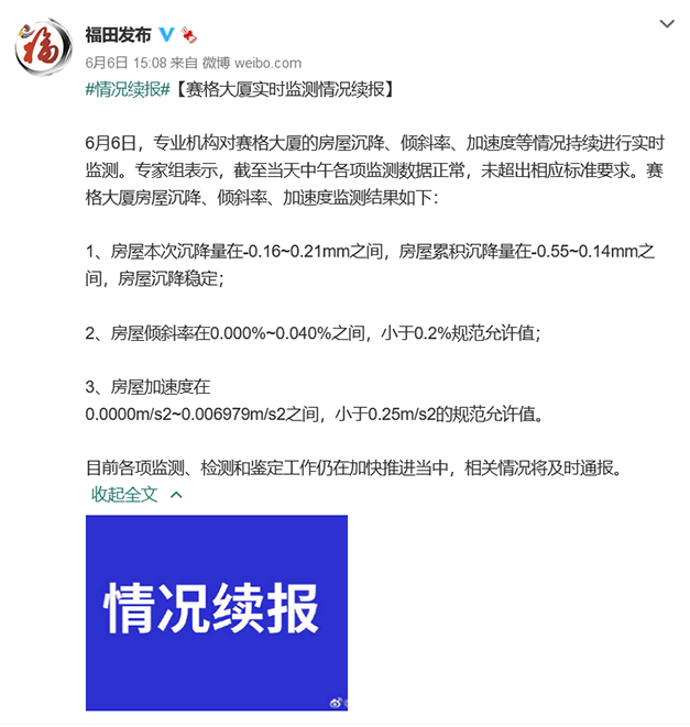 2021年06月30日,深圳市福田區(qū)人民政府發(fā)布“賽格大廈實時監(jiān)測情況續(xù)報”