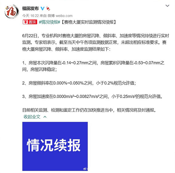 2021年06月22日,深圳市福田區(qū)人民政府發(fā)布“賽格大廈實時監(jiān)測情況續(xù)報”
