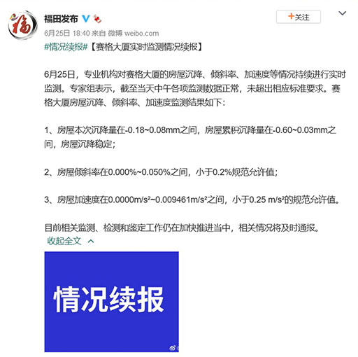 2021年06月25日,深圳市福田區(qū)人民政府發(fā)布“賽格大廈實時監(jiān)測情況續(xù)報”
