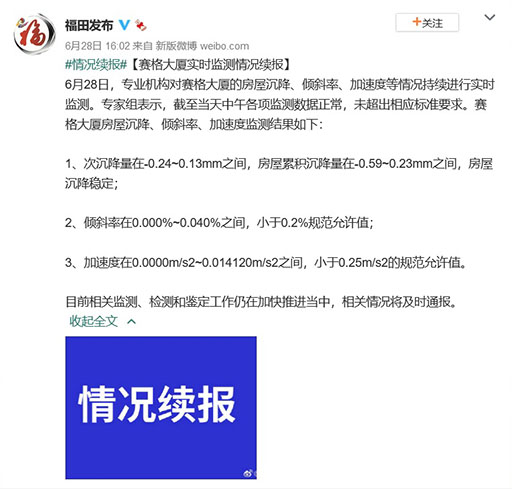 2021年06月28日,深圳市福田區(qū)人民政府發(fā)布“賽格大廈實時監(jiān)測情況續(xù)報”