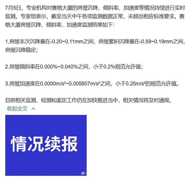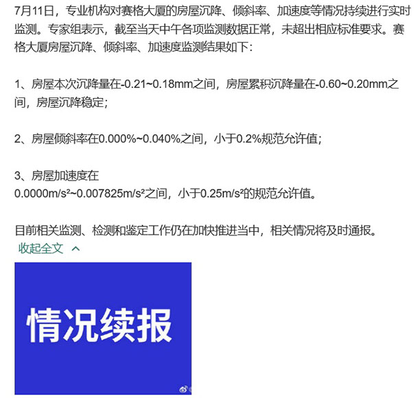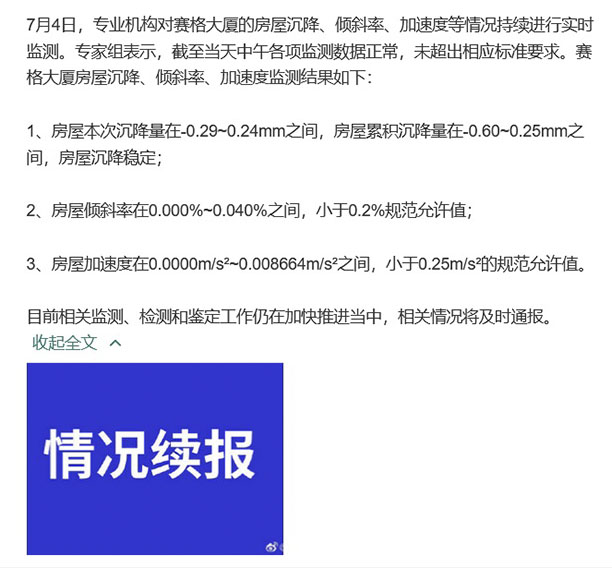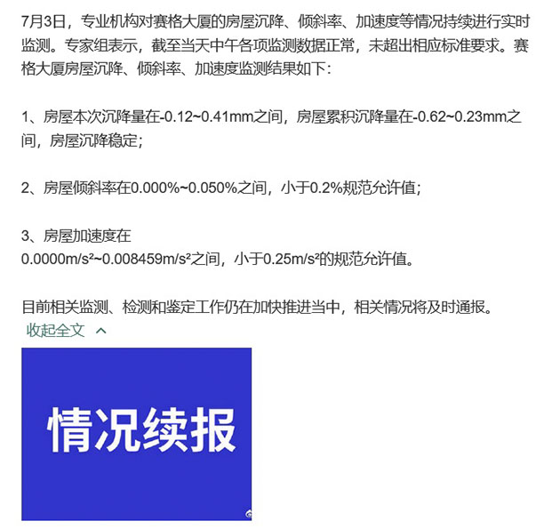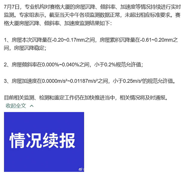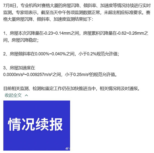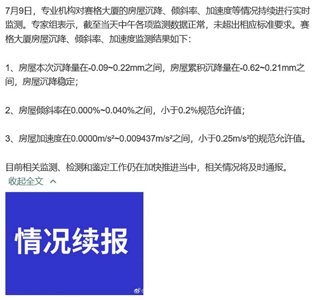 2021年07月11日,深圳市福田區(qū)人民政府發(fā)布“賽格大廈實時監(jiān)測情況續(xù)報”