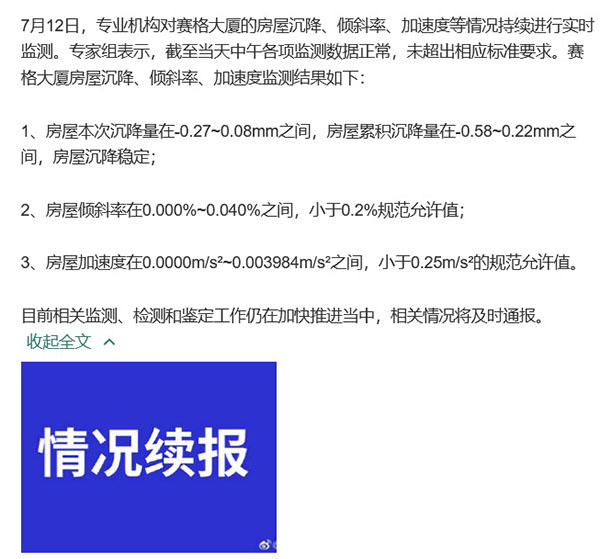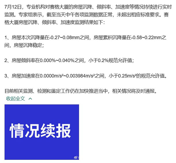 2021年07月12日,深圳市福田區(qū)人民政府發(fā)布“賽格大廈實時監(jiān)測情況續(xù)報”