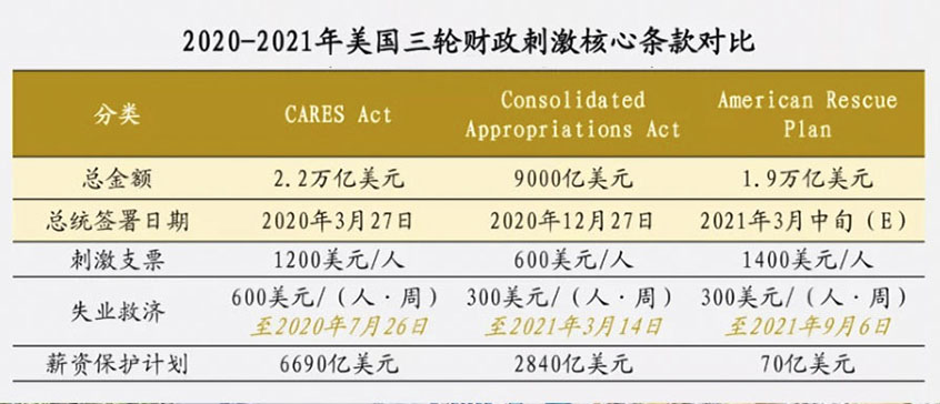 先來看看財(cái)政。最新1.9萬(wàn)億的通過非常戲劇化。這個(gè)數(shù)字首先是遠(yuǎn)遠(yuǎn)超過大家預(yù)期的,因?yàn)榘莸亲铋_始提出這項(xiàng)計(jì)劃時(shí),共和黨支持的刺激數(shù)字只有6000多億,之間差了1.3萬(wàn)億。而拜登之前又一直聲稱兩黨要團(tuán)結(jié)合作,大家就認(rèn)為他會(huì)做個(gè)折中,最后的量應(yīng)該也就在9000億美元左右