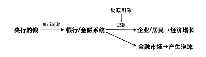 我們常說央行撒錢,但錢肯定不是直接撒在人民群眾身上的,而是首先撒給商業(yè)銀行等各個(gè)金融機(jī)構(gòu),構(gòu)成基礎(chǔ)貨幣。方法有很多種,包括調(diào)節(jié)再貼現(xiàn)率、調(diào)節(jié)存款準(zhǔn)備金率,和QE最相關(guān)的買賣政府債券也是其中之一,央行買進(jìn)債券的同時(shí)付出去一筆錢,實(shí)質(zhì)就是向金融系統(tǒng)注入一筆基礎(chǔ)貨幣。緊接著,各個(gè)銀行要么把這些錢投入實(shí)體經(jīng)濟(jì),也就是通過貸款的方式借給企業(yè)和家庭,讓他們進(jìn)行生產(chǎn)和消費(fèi),促進(jìn)經(jīng)濟(jì)增長(zhǎng);要么,如果大多數(shù)企業(yè)和家庭都不愿意借錢,剩下的錢就會(huì)以儲(chǔ)蓄的形式滯留在銀行體系內(nèi)部,或是流入股市等金融市場(chǎng),則一方面實(shí)體經(jīng)濟(jì)發(fā)展缺少資金驅(qū)動(dòng),另一方面金融市場(chǎng)又可能積累過量資金引發(fā)泡沫