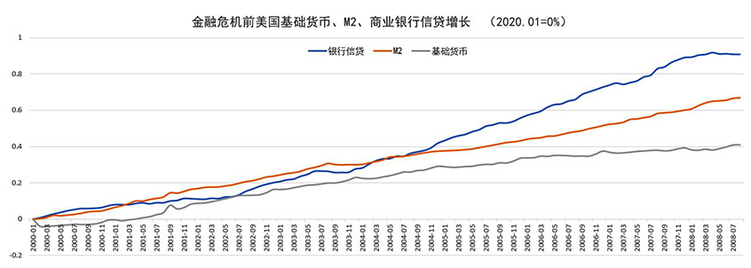 在QE前的世界,貨幣政策在上面一條道路上走得非常順暢,也就是美聯(lián)儲(chǔ)通過常規(guī)貨幣政策提供的流動(dòng)性,能很好地傳到企業(yè)和居民手里。經(jīng)濟(jì)衰退時(shí),一邊積極的財(cái)政政策穩(wěn)住企業(yè)和居民的信心,一邊央行降低政策利率,同時(shí)給銀行業(yè)提供流動(dòng)性;商業(yè)銀行一有錢,居民和企業(yè)也被低利率和財(cái)政刺激鼓舞著,積極借錢買房和投資。一旦經(jīng)濟(jì)開始復(fù)蘇,央行所要做的就是逐步提高政策利率,抑制信貸,從而防止通脹。于是從圖上可以看出,基礎(chǔ)貨幣、貨幣供應(yīng)、銀行信貸三條線教科書一般地同起同落,在此過程中,長(zhǎng)期利率也隨政策利率下降和回升。2008年前的美歐和1990年前的日本,就是處于這種狀態(tài)