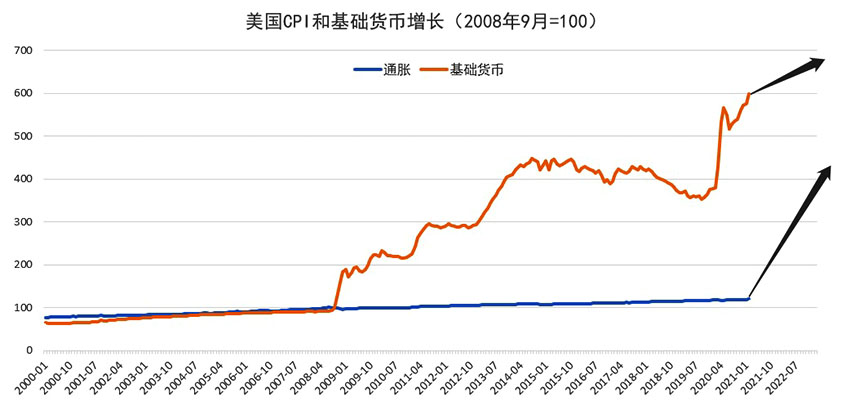 那么,在這樣史無(wú)前例的巨額刺激下,美國(guó)經(jīng)濟(jì)會(huì)發(fā)生什么呢?答案就是通脹上升,經(jīng)濟(jì)過熱,而且過熱程度可能比市場(chǎng)預(yù)期要嚴(yán)重得多。因?yàn)殚L(zhǎng)時(shí)間、大規(guī)模的QE,不知不覺給了通脹巨大的上行空間