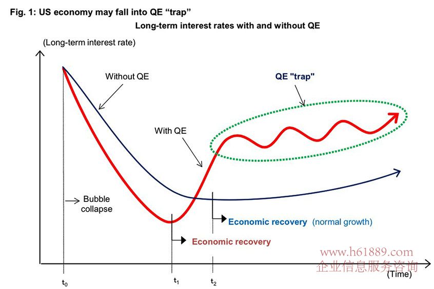 最初,QE國(guó)長(zhǎng)期利率降幅要比非QE國(guó)大得多,意味著隨后經(jīng)濟(jì)復(fù)蘇更快(t1)。但隨著經(jīng)濟(jì)的回暖,貨幣政策收緊,長(zhǎng)期利率迅速攀升,部分利率敏感行業(yè)又面臨需求下降,迫使央行重新放松政策立場(chǎng)。經(jīng)濟(jì)再次復(fù)蘇后,市場(chǎng)又開始擔(dān)心貨幣政策收緊的可能,一來二去,長(zhǎng)期利率就在一個(gè)所謂“QE Trap”的重復(fù)周期中上行