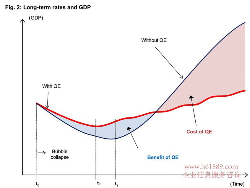 相比之下,非QE國(guó)長(zhǎng)期利率下降是漸進(jìn)的,這延遲了復(fù)蘇的開始(t2);但一旦經(jīng)濟(jì)開始好轉(zhuǎn),由于利率較低,復(fù)蘇步伐實(shí)際上會(huì)更快。長(zhǎng)期下來,QE的成本反而比非QE國(guó)要高