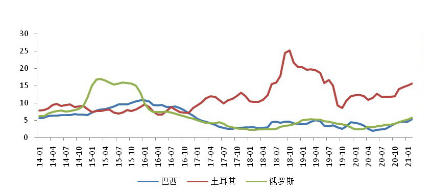 新興市場(chǎng)國(guó)家加息主要肯定是為了抑制通脹上行。這些國(guó)家下游消費(fèi)品端供應(yīng)鏈比較脆弱,又受到疫情沖擊,本來就處于供需缺口擴(kuò)大,物價(jià)高升的狀態(tài)。而它們又強(qiáng)烈依賴進(jìn)出口,于是隨著全球石油制品和食品價(jià)格快速上漲,只能被迫進(jìn)一步輸入通脹