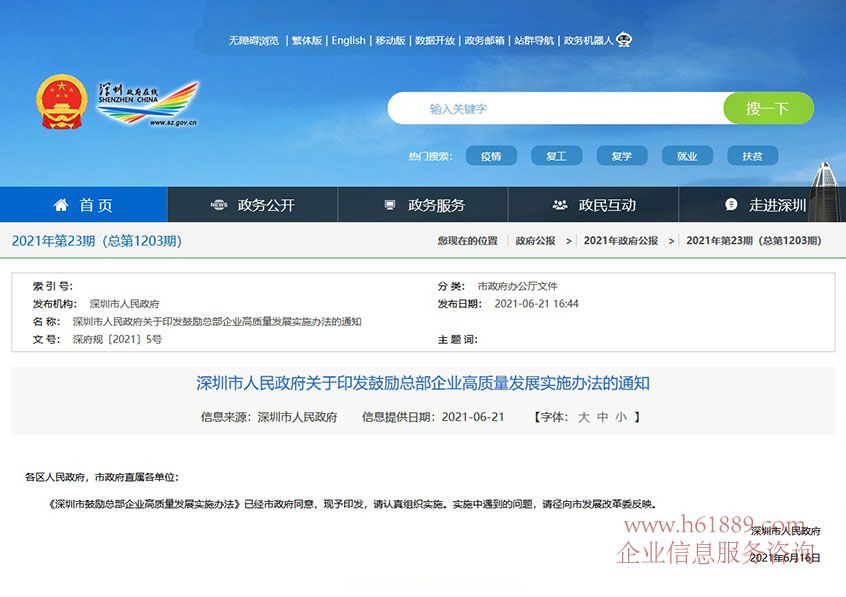 政府公報(bào)、2021年政府公報(bào)、2021年第23期(總第1203期)、深圳市鼓勵(lì)總部企業(yè)高質(zhì)量發(fā)展實(shí)施辦法全文