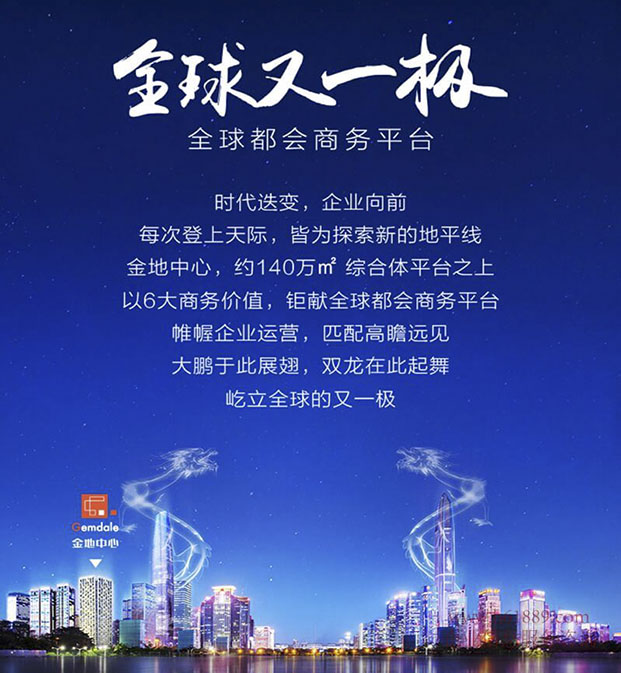 金地中心:全球又一極、全球都會(huì)商務(wù)平臺(tái)、時(shí)代迭變 企業(yè)向前、每次登上天際、皆為探索的地平線金地中心、約140萬平米、綜合體平臺(tái)之上以6大商務(wù)價(jià)值、鉅獻(xiàn)全球都會(huì)商務(wù)平臺(tái)、帷幄企業(yè)運(yùn)營、匹配高瞻遠(yuǎn)見、大鵬于此展翅、雙龍?jiān)诖似鹞?、屹立全球又一極