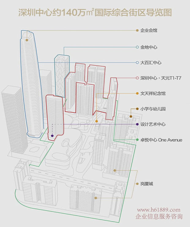 深圳中心約140萬米國際綜合街區(qū)導(dǎo)覽圖、企業(yè)會(huì)館、金地中心、大百匯中心、深圳中心天元T1-T7棟、文天祥紀(jì)念館、小學(xué)與幼兒園、設(shè)計(jì)藝術(shù)中心、卓悅中心 One Avenue、崗廈城