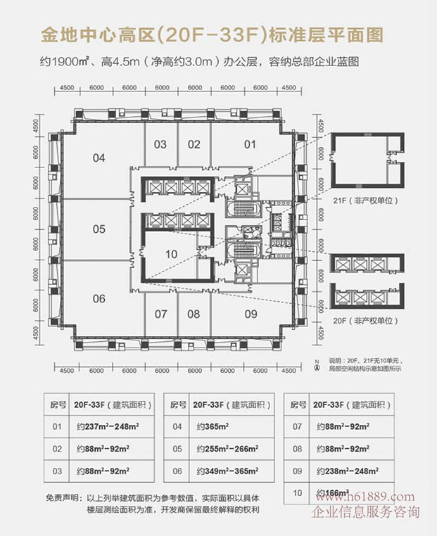 金地中心:高區(qū)(20F-33F)標(biāo)準(zhǔn)層平面圖、約1900平米、高:4.5米(凈高3.0米)辦公層、容納總部企業(yè)藍(lán)圖