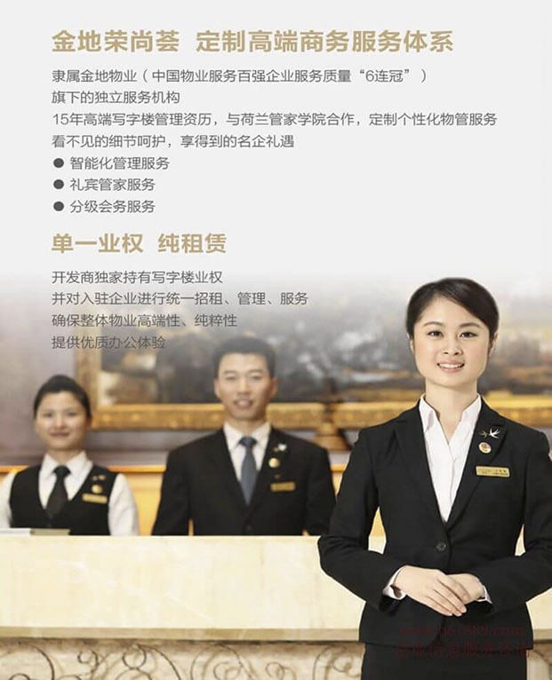 金地榮尚薈:定制高端商務(wù)服務(wù)體系、隸屬金地物業(yè)(中國物業(yè)服務(wù)百強(qiáng)企業(yè)服務(wù)質(zhì)量“6連冠”) 旗下的獨(dú)立服務(wù)機(jī)構(gòu) 15年高端寫字樓管理資歷、與荷蘭管家學(xué)院合作、定制個(gè)性化物管服務(wù)、看不見的細(xì)節(jié)呵護(hù)、享得到的名企禮遇、智能化管理服務(wù)、禮賓管家服務(wù)、分級(jí)會(huì)務(wù)服務(wù)、單一業(yè)權(quán)純租賃、開發(fā)商獨(dú)家持有寫字樓業(yè)權(quán)、對(duì)入駐企業(yè)進(jìn)行統(tǒng)一招租、管理、服務(wù)、確保整體物業(yè)高端性、純粹性、提供優(yōu)質(zhì)辦公體驗(yàn)
