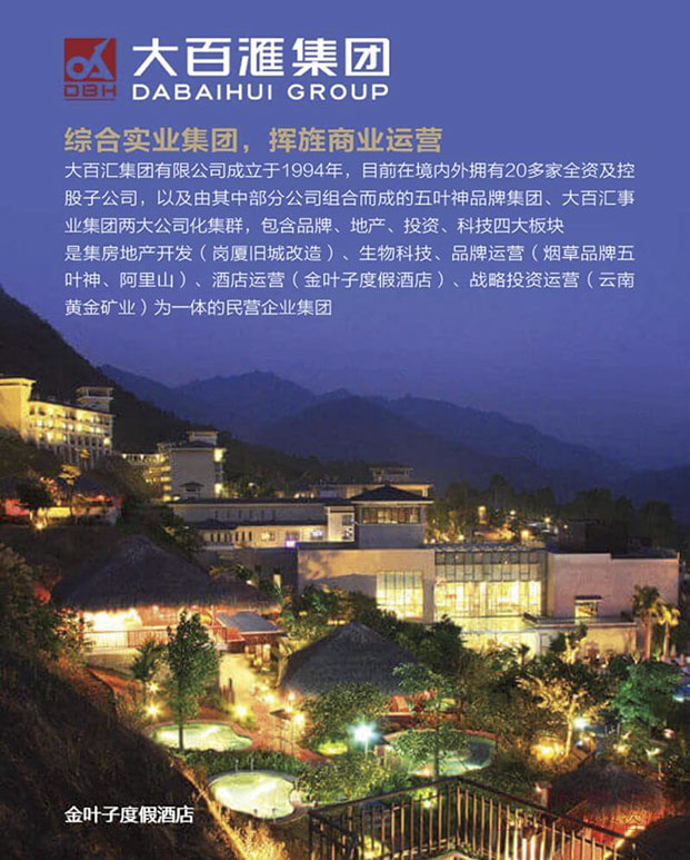 大百匯集團(tuán):大百匯集團(tuán)簡介:大百集團(tuán):綜合實(shí)業(yè)集團(tuán)、揮旌商業(yè)運(yùn)營、大百匯集團(tuán)有限公司成立于1994年、目前在境內(nèi)外擁有20多家全資及控股子公司、以及由其中部分公司組合而成的五葉神品牌集團(tuán)、大百匯事業(yè)集團(tuán)兩大公司化集群、包含品牌、地產(chǎn)、投資、科技四大板塊是集房地產(chǎn)開發(fā)(崗廈舊城改造)、生物科技、品牌運(yùn)營(煙草品牌五、葉神、阿里山)、酒店運(yùn)營(金葉子度假酒店)、戰(zhàn)略投資運(yùn)營(云南 黃金礦業(yè))為一體的民營企業(yè)集團(tuán)