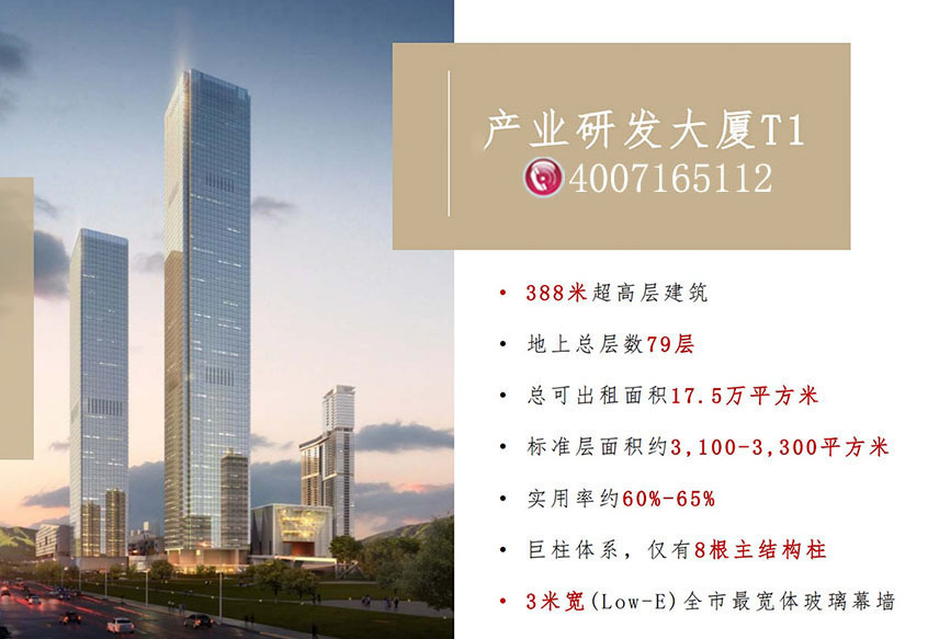深業(yè)上城、產(chǎn)業(yè)研發(fā)大廈、T1棟、388米超高層建筑、地上總層數(shù)7 9層、總可出租面積:17.5萬平方米、標準層面積約:3、100– 3、300平方米、實用率約60% - 65%、巨柱體系、僅有8根主結(jié)構(gòu)柱、 3米寬(Low - E)全市最寬體玻璃幕