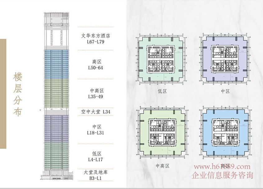 深業(yè)上城 T1棟 樓層分布:文華東方酒店:L67-L79層、高區(qū):L50-64層、中高區(qū):L35-49層、空中大堂: L34、中區(qū):L18-L31層、低區(qū):L4-L17層、大堂及地庫:B3-L1層