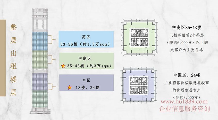 高區(qū):5 3- 5 6樓(約1.3萬sqm)、中高區(qū):3 5- 4 3樓(約3萬sqm)、中區(qū):18樓、24