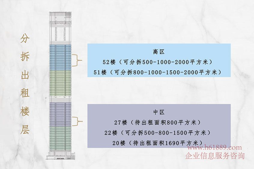 中區(qū):2 7樓(待出租面積800平方米)2 2樓(可分拆500- 800- 1500平方米)2 0樓(待出租面積1690平方米)