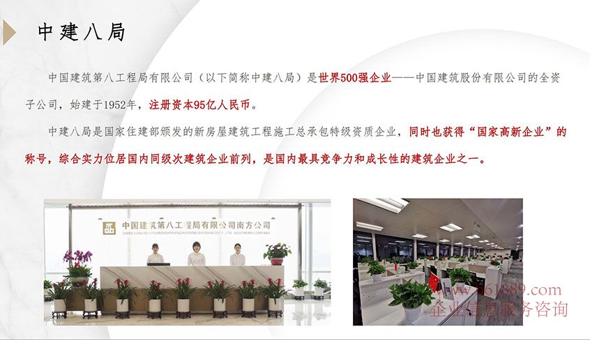 中國建筑第八工程局有限公司(以下簡稱中建八局)是世界500強企業(yè)——中國建筑股份有限公司的全資子公司,始建于1952年,注冊資本95億人民幣、中建八局是國家住建部頒發(fā)的新房屋建筑工程施工總承包特級資質(zhì)企業(yè),同時也獲得“國家高新企業(yè)”的稱號,綜合實力位居國內(nèi)同級次建筑企業(yè)前列,是國內(nèi)最具競爭力和成長性的建筑企業(yè)之一