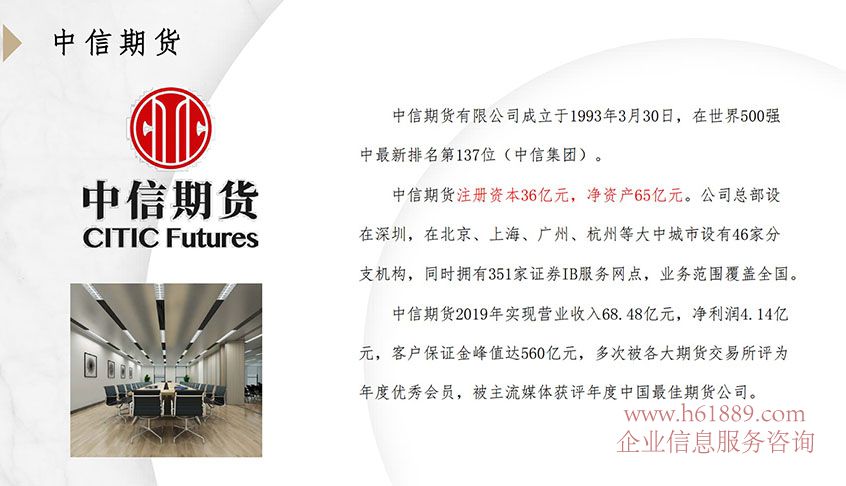 中信期貨有限公司成立于1993年3月30日,在世界500強中最新排名第137位(中信集團)、中信期貨注冊資本36億元,凈資產(chǎn)65億元。公司總部設(shè)在深圳,在北京、上海、廣州、杭州等大中城市設(shè)有46家分支機構(gòu),同時擁有351家證券IB服務(wù)網(wǎng)點,業(yè)務(wù)范圍覆蓋全國。中信期貨2019年實現(xiàn)營業(yè)收入68.48億元,凈利潤4.14億元,客戶保證金峰值達560億元,多次被各大期貨交易所評為年度優(yōu)秀會員,被主流媒體獲評年度中國最佳期貨公司