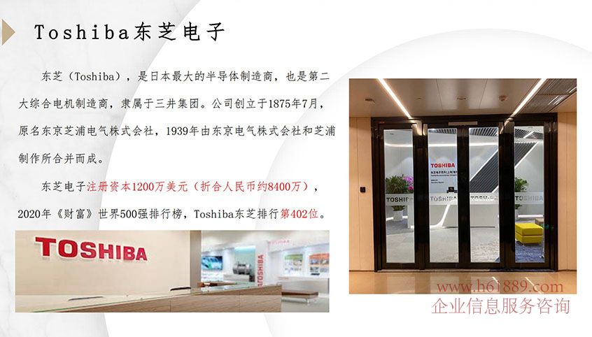 東芝(Toshiba),是日本最大的半導體制造商,也是第二大綜合電機制造商,隸屬于三井集團。公司創(chuàng)立于1875年7月,原名東京芝浦電氣株式會社,1939年由東京電氣株式會社和芝浦制作所合并而成。東芝電子注冊資本1200萬美元(折合人民幣約8400萬),2020年《財富》世界500強排行榜,Toshiba東芝排行第402位