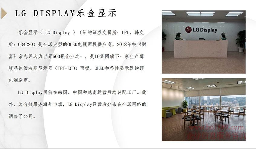 樂金顯示( LG Display )(紐約證券交易所:LPL,韓交所:034220)是全球大型的OLED電視面板供應商,2018年被《財富》雜志評選為世界500強企業(yè)之一,是LG集團旗下一家生產(chǎn)薄膜晶體管液晶顯示器(TFT-LCD)面板、OLED和柔性顯示器的領(lǐng)先制造商。LG Display目前在韓國、中國和越南運營后端裝配工廠。此外,為有效服務(wù)海外市場,LG Display經(jīng)營者分布在全球網(wǎng)絡(luò)的銷售子公司