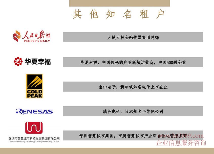 深業(yè)上城 T1棟 其 他 知 名 租 戶:人民日報金融傳媒集團總部、華夏幸福,中國領(lǐng)先的產(chǎn)業(yè)新城運營商,中國500強企、金山電子,新加坡知名電子上市企業(yè)、瑞薩電子,日本知名半導體公司、深圳智慧城市集團,市屬智慧城市產(chǎn)業(yè)綜合性運營服務(wù)商