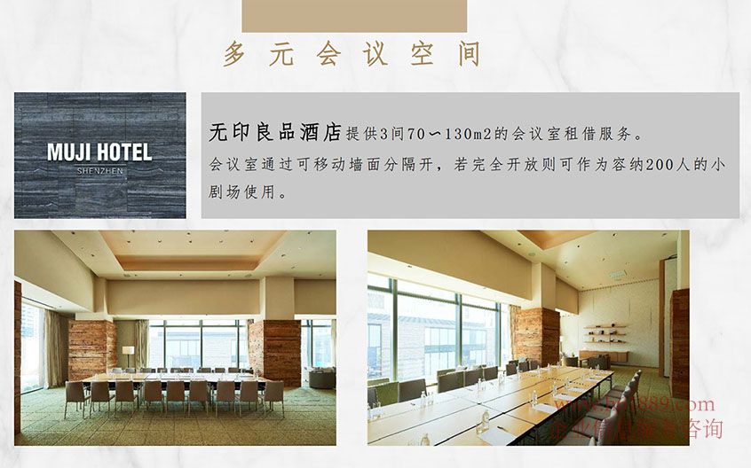 無印良品酒店提供3間7 0?130m2的會議室租借服務(wù)。會議室通過可移動墻面分隔開,若完全開放則可作為容納200人的小劇場使用