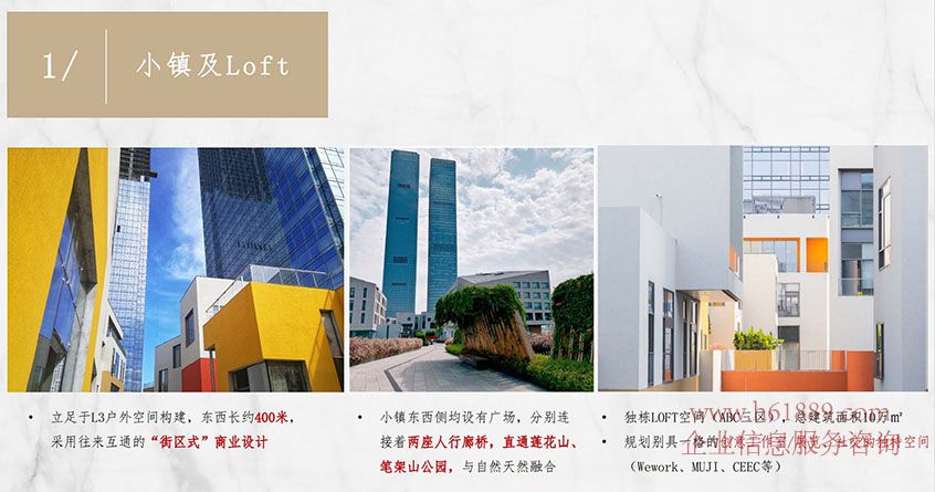 立足于L3戶外空間構(gòu)建、東西長約400米、采用往來互通的“街區(qū)式”商業(yè)設(shè)計、小鎮(zhèn)東西側(cè)均設(shè)有廣場、分別連接著兩座人行廊橋,直通蓮花山、 筆架山公園,與自然天然融合、獨棟LOFT空間(ABC三區(qū)),總建筑面積10萬㎡
