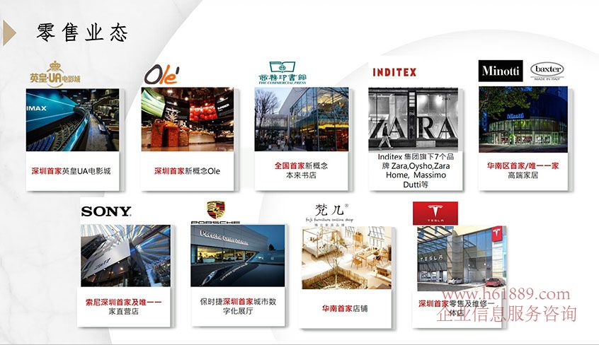 零售業(yè)態(tài):深圳首家英皇UA電影城、深圳首家新概念Ole、全國首家新概念本來書店、Inditex 集團旗下7個品牌 Zara,Oysho,ZaraHome, MassimoDutti等、華南區(qū)首家/唯一一家高端家、索尼深圳首家及唯一一家直營店、保時捷深圳首家城市數(shù)字化展廳、華南首家店鋪、深圳首家零售及維修一體店