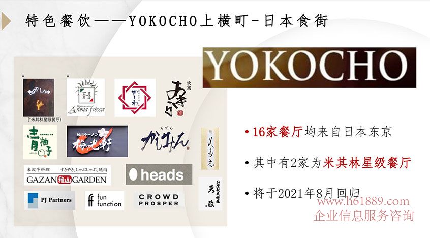 特色餐飲 — — YOKOCHO 上橫町 - 日 本 食 街、16家餐廳均來自日本東京、其中有2家為米其林星級餐廳