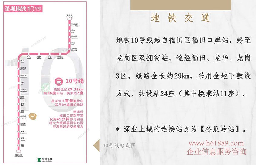 深業(yè)上城、地鐵交通:地鐵10號線起自福田區(qū)福田口岸站,終至龍崗區(qū)雙擁街站,途經(jīng)福田、龍華、龍崗3區(qū),線路全長約29km,采用全地下敷設(shè)方式,共設(shè)站24座(其中換乘站11座)深業(yè)上城的連接站點為【冬瓜嶺站】