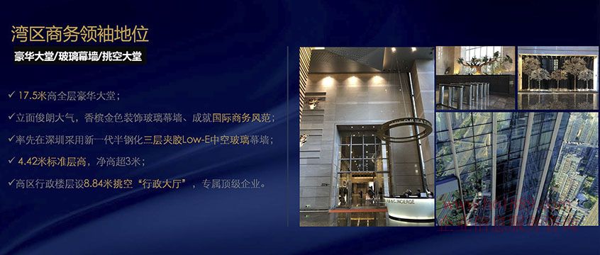 灣區(qū)商務(wù)領(lǐng)袖地位:豪華大堂/玻璃幕墻/挑空大堂、17.5米高全層豪華大堂;立面俊朗大氣,香檳金色裝飾玻璃幕墻、成就國(guó)際商務(wù)風(fēng)范;率先在深圳采用新一代半鋼化三層夾膠Low-E中空玻璃幕墻;4.42米標(biāo)準(zhǔn)層高,凈高超3米;高區(qū)行政樓層設(shè)8.84米挑空“行政大廳”專屬頂級(jí)企業(yè)