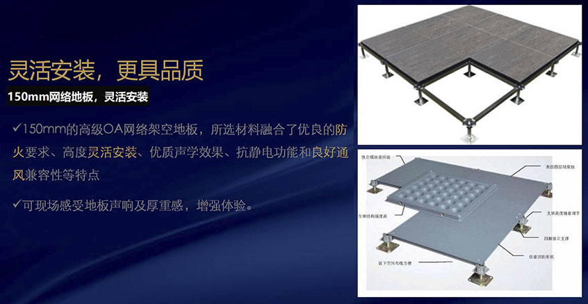 靈活安裝:更具品質(zhì)、150mm網(wǎng)絡(luò)地板,靈活安裝、150mm的高級(jí)OA網(wǎng)絡(luò)架空地板,所選材料融合了優(yōu)良的防 火要求、高度靈活安裝、優(yōu)質(zhì)聲學(xué)效果、抗靜電功能和良好通 風(fēng)兼容性等特點(diǎn)、可現(xiàn)場(chǎng)感受地板聲響及厚重感,增強(qiáng)體驗(yàn)