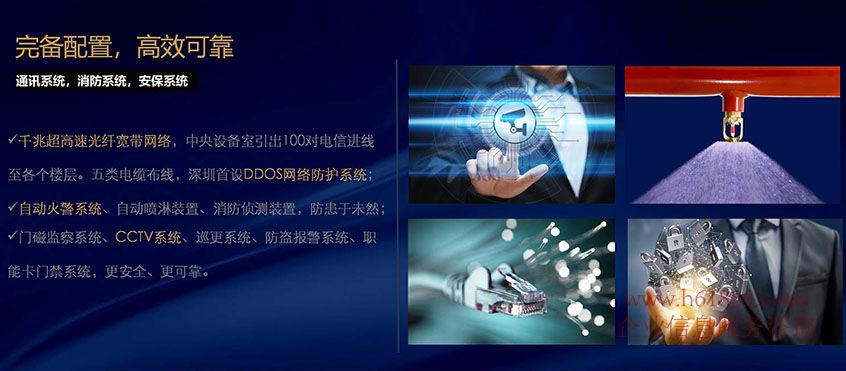 東海中心【東海國(guó)際中心】完備配置、高效可靠、通訊系統(tǒng),消防系統(tǒng),安保系統(tǒng)、千兆超高速光纖寬帶網(wǎng)絡(luò),中央設(shè)備室引出100對(duì)電信進(jìn)線至各個(gè)樓層。五類電纜布線,深圳首設(shè)DDOS網(wǎng)絡(luò)防護(hù)系統(tǒng)